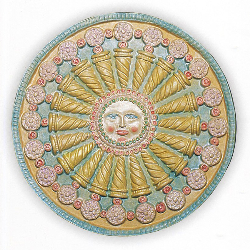 Patinata. Piccoli torchon di antica arte orafa, si ingrandiscono divenendo il pretesto per un piacevole gioco decorativo. Colori: azzurro, verde, giallo, ocra, rosso, viola.